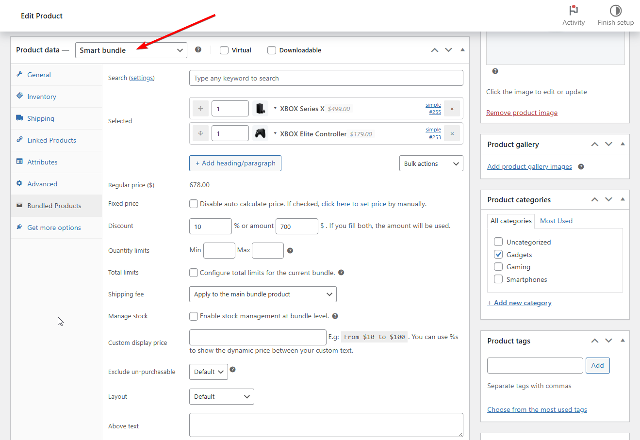 Next, open a product page, go to Product Data → Smart Bundles to create your bundle.